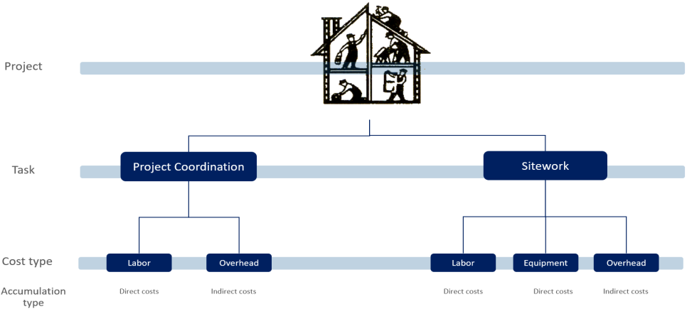 A work breakdown structure (WBS) represents project work in a visual hierarchy of manageable sections. The Construction subscription enables the project, task, and cost type dimensions. While use is optional, you cannot disable these dimensions. As a WBS best practice, use the dimensions together to build the project hierarchy. The project is independent of tasks or cost types. Tasks are unique to a specific project; and cost types depend on the existence of the project and task dimensions. The uniqueness of a cost type is bound to a specific project and task, meaning you cannot select a cost type without first identifying the project and task in that project. Use accumulation types to group and summarize cost type information for reporting.
